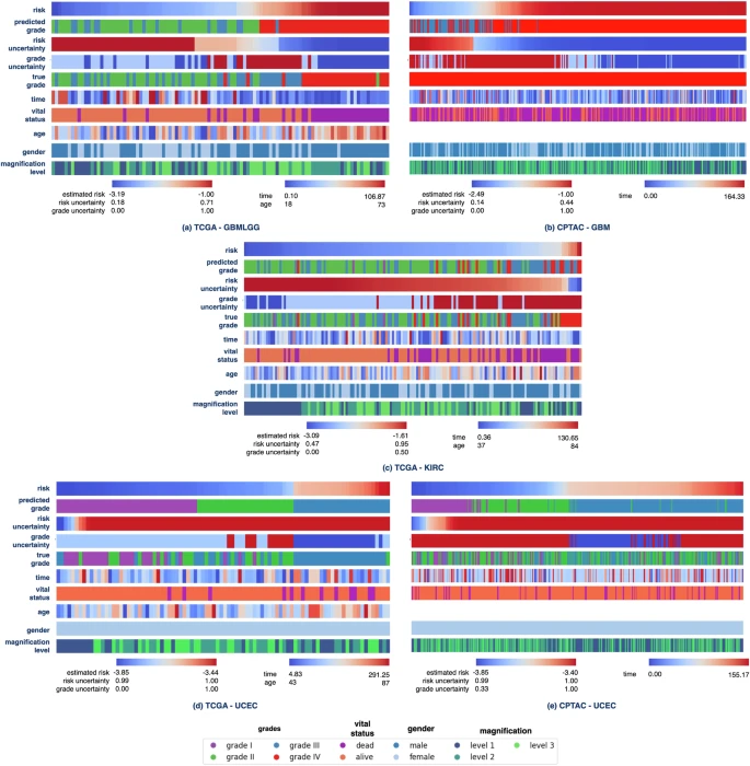 Figure 6: 模型预测在不同人口统计类别和数据队列中公平性评估的示例结果。病例按预测患者风险的升序排列,同时展示了生存风险和分级预测的估计不确定性。源数据以源数据文件形式提供。