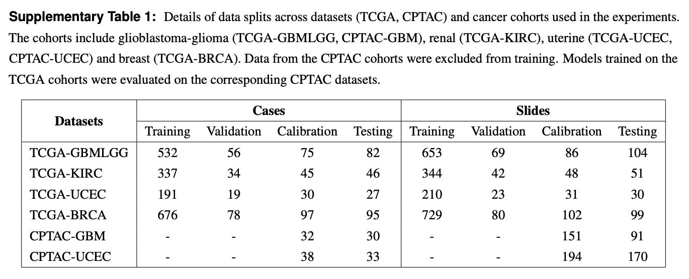 - 在四种癌症(胶质瘤、肾癌、子宫癌、乳腺癌)的数据集(TCGA和CPTAC)上进行了严格测试,结果显示: